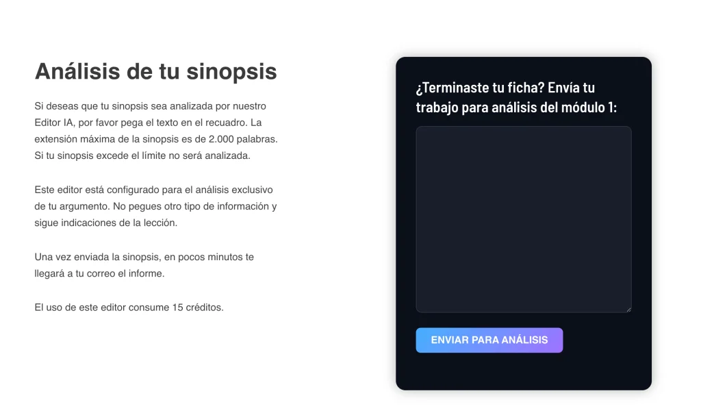Cada módulo incluye lecciones en vídeo y una plantilla que vas completando paso a paso. Si tienes dudas, el asistente IA está ahí para ayudarte. Al finalizar, puedes enviar tu ficha para recibir un análisis generado por nuestros Editores Inteligentes. Todo se adapta a tu ritmo y tus decisiones.