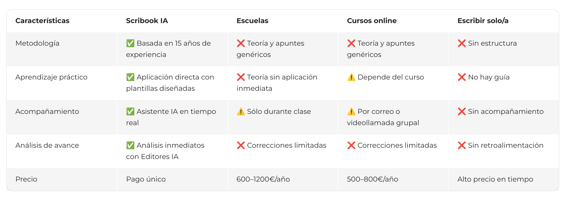 Es muy probable que ahora mismo estés considerando otras opciones que te ayuden a escribir tu novela. A continuación hemos creado una tabla para que puedas comprobar por ti mismo qué nos hace únicos.